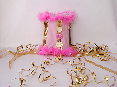 3. המחוך מוכן. מה שנותר כעת הוא רק לקשט: לצייר פרחים על הקרטון, לגזור ולהדביק. אפשר לשים דבק דו צדדי מסביב לתחתית המחוך ומעל להדביק סרטים. רצוי להדביק מעל הדבק הדו צדדי פרחים, כך שיכסו את כל הדבק. מי שבוחר להדביק פרווה - צריך להיעזר באדם נוסף, האחד מותח את המחוך והשני מורח דבק מסביב לתחתית המחוך ומעל מדביקים את הפרווה. המתיחה חשובה כדי שהמחוך ישמור על האלסטיות שלו והילדה תוכל ללבוש אותו בנינוחות.