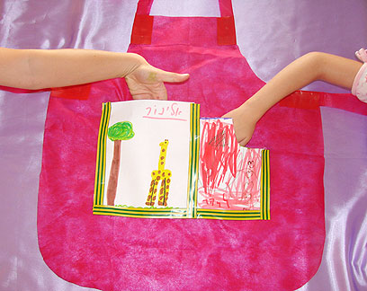 3. להכנת הכיסים: שרטטו על גבי נייר מלבן בגודל 16/20 ס"מ ומלבן נוסף בגודל 13/17 ס"מ ותנו לילדים לצייר בתוך המלבנים כאוות נפשם. גיזרו מסביב למלבנים והדביקו על הסינר בעזרת דבק פלסטי. אפשר להדביק מסביב למלבנים גם איזולירבנד. זיכרו להשאיר את החלק העליון של המלבנים ללא דבק. הם ישמשו לכיסים. רצוי לתת לסינר מספר דקות להתייבש.