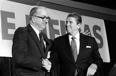 הנשיא לשעבר רונלד רייגן וג'סי הלמס, 1983 (צילום ארכיון: AP)