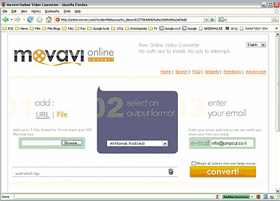 באתרי המרה כמו movavi או YouConvertIt מעלים את הקובץ לאתר, מגדירים פורמט רצוי להמרה. נותנים את כתובת הדואר האלקטרוני ותוך דקות מקבלים לינק לסרט המומר, מוכן להורדה למחשב. זהו פתרון נוח וקל, שאינו דורש התקנה של תוכנה. ההגבלה היחידה שם, שיש אפשרות להורדה של חמישה קטעים באורך של עד 10 דקות, שמשקלם פחות ממאה מגהבייט. שימו לב: השירות מאחסן את הסרט למשך יום אחד בלבד.