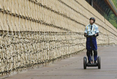בלי לפגוע בסביבה. מאבטח יפני על סגווי באתר הכינוס (צילום: רויטרס)