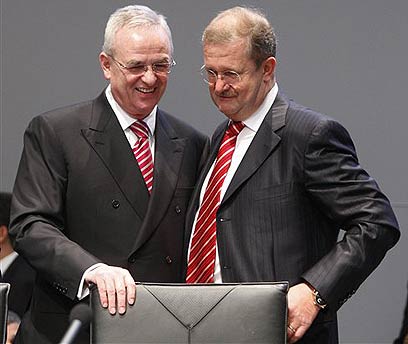 מנכ"ל פורשה, ונדלין ויידקינג (מימין) ומנכ"ל פולקסווגן, מרטין וינטרקורן. ההשתלטות קרובה מתמיד (צילום: איי פי)