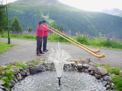 נגני קרן-האלפים בכניסה למלון בדאבוס (צילום: יעל גרטי)