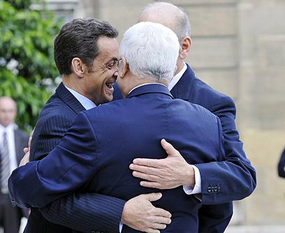 חיבוק צרפתי: אולמרט, אבו מאזן וסרקוזי בפריז (צילום: AFP)