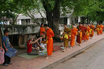 בכל בוקר עם עלות השחר, יוצאת שיירה ארוכה של עשרות נזירים מכל מקדש בעיר. התהלוכה מתנקזת לרחובותיה הראשיים של העיר, וטור ארוך של מאות נזירים מלקטים מנחות מהתושבים המקומיים ומתיירים. זו מצווה לתרום לנזירים, ועשרות מקומיים כורעים ברך ומחלקים להם אורז דביק ופירות בכל בוקר. יש לשמור על כבוד הנזירים ולכבד את המסורת הבודהיסטית, להקפיד להיות נמוך מהנזירים, לעטות לבוש צנוע ולשמור על מרחק סביר כשמצלמים את האירוע.