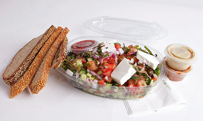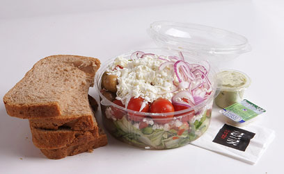 סלט ירקות ופטה של לחם ארז. מחיר: 38 שקל. משקל: 394 גרם.