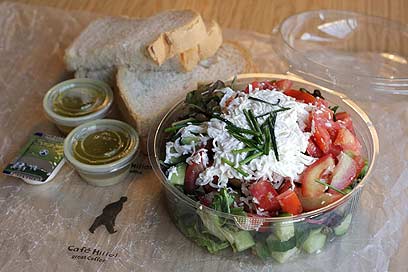 סלט עם גבינה של קפה ג'ו. מחיר: 37 שקל. משקל: 515 גרם. שומן: 23 גרם.