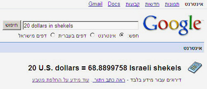 תוכלו להשתמש גם בקיצורים מקובלים. הקלידו לדוגמא: NIS in 20 USD