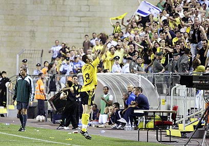 הפך ליקיר העיר. ברוכיאן חוגג עם הקהל בטדי (צילום: דודי ועקנין)