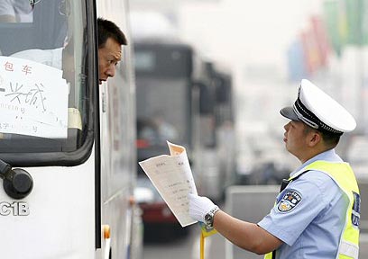 שוטר סיני בודק את מסמכיו של נהג בבייג'ינג, היום (צילום: רויטרס)