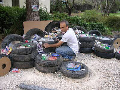 "בית מגורים שעשוי מצמיגים במקום מבלוקים. בשנות ה-70' בנו בארה"ב 'ספינות אדמה', בתים ללא ציפוי, פשוט צמיגים שהונחו אחד על השני כשהם מלאים באדמה, קש ובוץ. זה אקט חינוכי, זה מראה שניתן להשתמש בזבל ולא רק להשליך אותו".