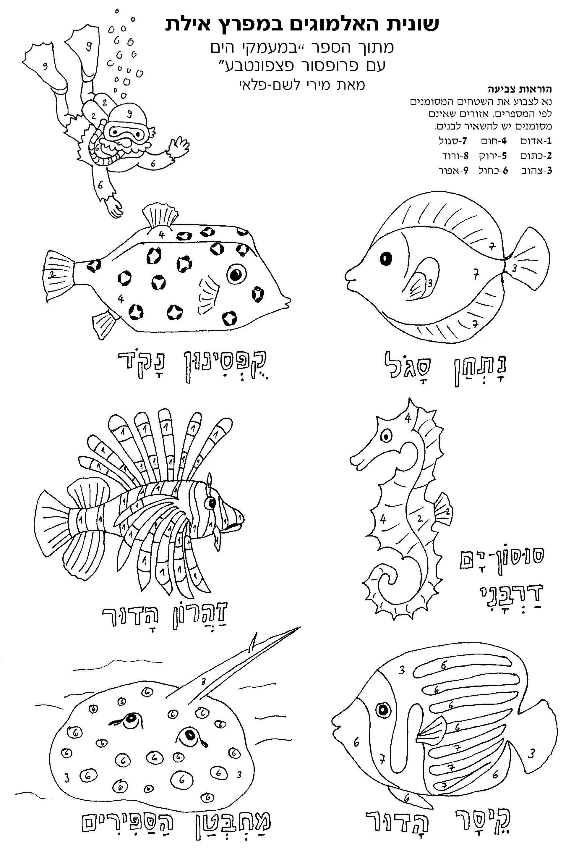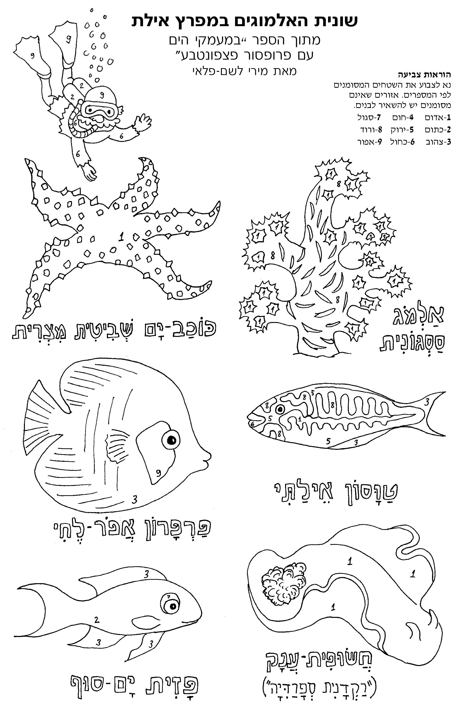 כדי להתכונן לנסיעה, הכנו עבורכם מיני-מגדיר לצביעה עצמית ובו כמה סוגים של יצורי-ים יפים ומעניינים שתפגשו בשונית. הדפיסו את שני הדפים המצורפים ותנו לילדים לצבוע לפי הצבעים המסומנים. תוך כדי צביעה יכירו הילדים את היצורים השונים וישימו לב לעושר הרב של הצבעים והדוגמאות המעטרים אותם. קחו אתכם את הדפים המוכנים ובזמן צפייה בשונית נסו לגלות ולזהות את דיירי שונית האלמוגים.