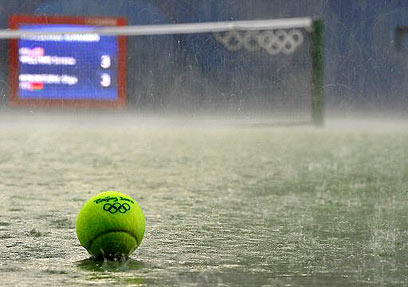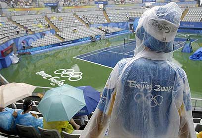 בינתיים היום הראשון של טורניר הטניס באולימפיאדת 2008 מזכיר בינתיים בעיקר את הגראנד סלאם הבריטי, הידוע לשמצה בשל הפסקות הגשם הרבות שלו.