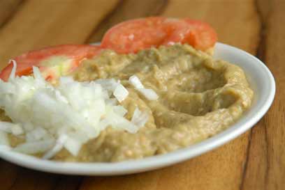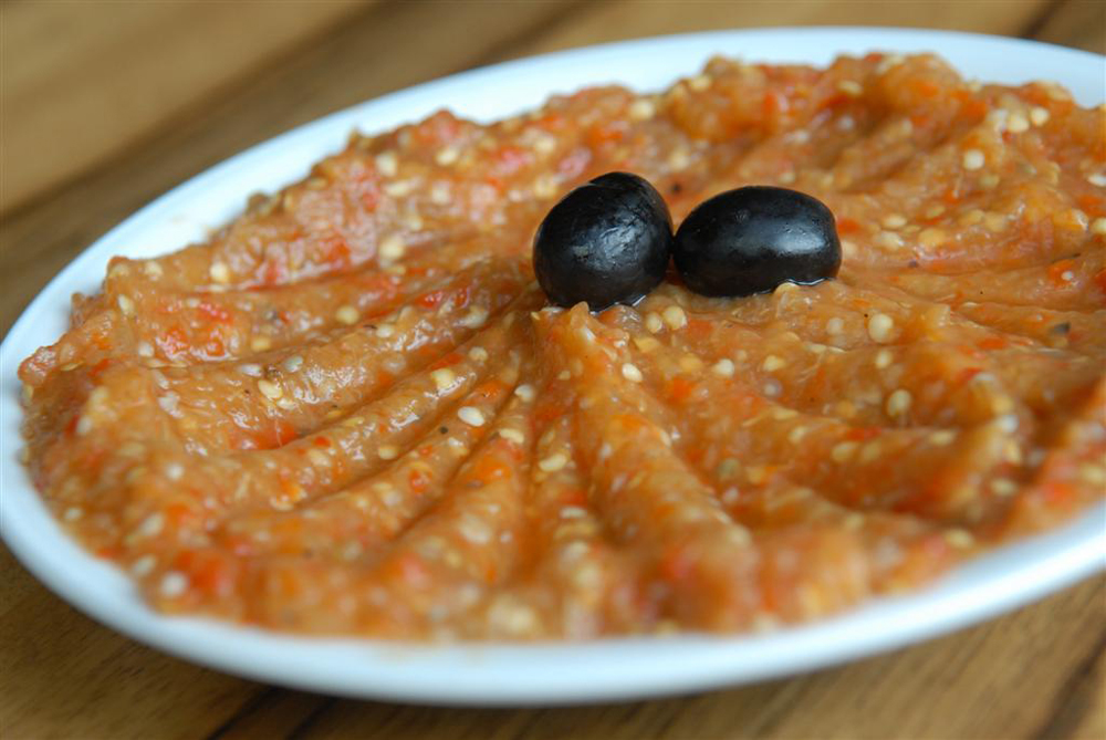 - מניחים את בשר החציל על קרש חיתוך וכותשים (ניתן לכתוש בעזרת סכין עץ שניתן לרכוש בחנויות כלי בית) בצורה אלכסונית (ימינה ושמאלה) תוך הזלפת מעט שמן לסירוגין, עד לקבלת מרקם של פירה גס. מוסיפים את השום ומתבלים במעט מלח. מגישים עם בצל קצוץ, חצאי עגבנייה וזיתים שחורים.