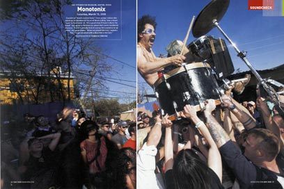 כבר ממבט ראשון, אפשר לראות את העוצמה האדירה במוזיקה של "מונוטוניקס". הרגל חזקה על פדל הדיסטורשן, המכות כואבות לעורות התופים והטירוף מבזיק בעיניים. גם השפמים המשונים שעל פניהם והשיערות הפרועות בהחלט תורמים לעניין. אבל כל אלה מחווירים לעומת הופעותיה של "מונוטוניקס" בארצות הברית ובאירופה, מחזה בו לא נתקלים בכל יום. הכל התחיל בסיבוב המלא הראשון בארצות הברית, בהופעה בריצ'מונד שבוירג'יניה. "זו היתה הפעם הראשונה שהגענו למסיבת בית", נזכר שלו.