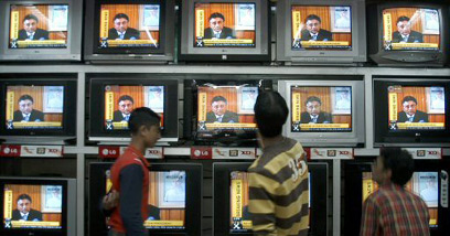 צופים בנאום הפרישה של מושארף, היום בהודו (צילום: רויטרס)
