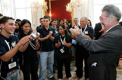 המשלחת הגיעה גם לפגישה רשמית עם נשיא אוסטריה דר' היינץ פישר. "מצאנו את עצמנו שעה ארוכה יחד עם איש חם ולבבי, שסיפר שהתנדב בקיבוץ וניסה ככל יכולתו להיות לא פורמלי ולבבי". מספר בנימין. "אחת הבנות הערביות שרה לנשיא בקול זהב ובאופן ספונטאני, את 'דמיין' של ג'ון לנון. הייתה צמרמורת בארמון, כל מי שהיה בחדר התרגש מאד. הנשיא מחא כפיים בהתלהבות, הרים אותה וסובב אותה תוך כדי חיבוק חם", הוא מוסיף נרגש. "מרגע זה, כבר הרגשנו ממש בבית. הצטלמנו, והבנו שאוסטריה מחבקת אותנו". בדצמבר אגב, היינץ צפוי להגיע לביקור רשמי בארץ, חברי הקבוצה מתכננים להפתיע ולפגוש אותו.