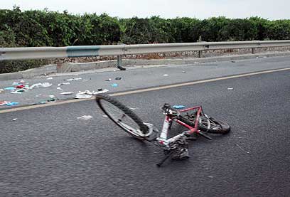 מספר מטרים מרוכב האופנוע שכב רוכב האופניים, ככל הנראה עובד זר מסין כבן 30. צוות נוסף של מד"א שהוזעק למקום טיפל בו. הפראמדיק מועאויה כבהא: "הוא היה מחוסר הכרה וסבל מפגיעת ראש קשה ופגיעה רב-מערכתית. ביצענו בו פעולות מצילות חיים ופינינו אותו לבית חולים בלינסון בפתח תקווה". במקום התאונה לא נמצאה קסדה וככל הנראה הרוכב אופניים רכב ללא קסדה.