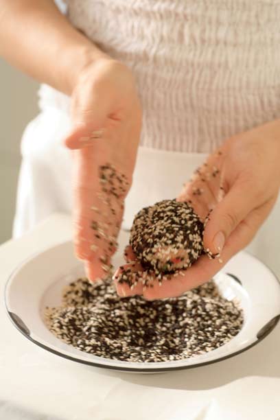 - מערבבים את חומרי הקציצות בקערה. יוצרים קציצות אובאליות ופחוסות, טובלים בשומשום לציפוי שני הצדדים ומניחים על תבנית מרופדת בנייר אפייה.