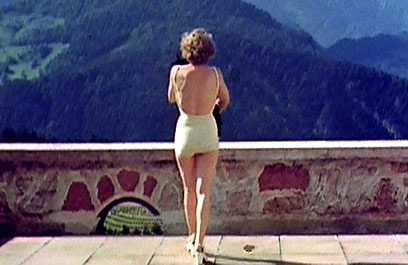 אווה בראון משקיפה על הנוף בברגהוף, "מפלט בהרים" (צילום מתוך הסרט)