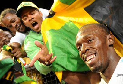 אוסיין בולט וחברים, אחרי הניצחון הקליל בלוזאן (צילום: AFP)