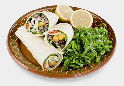 ברשתות השיווק או בחנויות טבע אפשר למצוא אריזות של עלי טורטיה מקסיקניות, מעין לאפות קטנות. מורחים כל עיגול טורטיה בגבינה לבנה, מניחים מעל חביתה עגולה וירקות חתוכים ומגלגלים כמו לאפה. עוטפים בצורה הדוקה בנייר לסנדוויצ'ים. אפשר להכין גם עם רצועות חזה עוף צלויות, והבה נודה: אפשר גם עם שניצל, קטשופ ומיונז (שימו לב, לא בימים חמים!), ירקות וחסה.