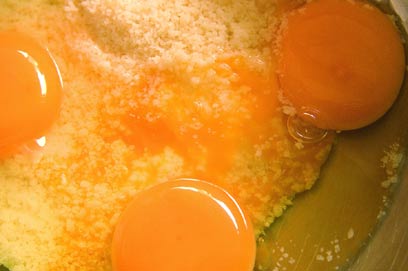 - את זמן הבישול מקדישים לטריפה נמרצת של החלמונים יחד עם הגבינה הצהובה ומעט מלח.