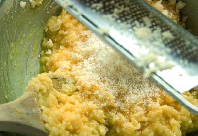 - ברגע שהאורז מוכן, מסננים במהירות ומעבירים אותו לקערת ההגשה. מוסיפים לאורז את החלמונים הטרופים. מערבבים במהירות עד שכל גרגרי האורז מצופים בקטיפה צהבהבה של חלמון וגבינה. מוסיפים את החמאה ומערבבים. מוסיפים פרמזן לפי הטעם, מערבבים ומגישים.