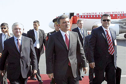 הנשיא הטורקי בנמל התעופה בירוואן (צילום: AP)