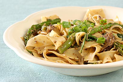הגדלתי מעט את כמות הירקות בהשוואה למתכון המקורי, שכן אינני אוהבת להשאיר במקרר מחצית מיותמת של חבילת פטריות או של צרור אספרגוס. המתכון המקורי כלל גם כרוב סיני, שקשה להשיג בימים אלה, ולכן ויתרתי עליו.