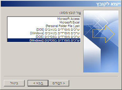 כדי לייבא את ספר הכתובות שלכם מתוכנת אאוטלוק, עליכם לייצא אותו תחילה לקובץ בפורמט CSV. היכנסו לתפריט קובץ / ייבוא וייצוא, בחרו בייצוא לקובץ ואז בערכים מופרדים בפסיקים (Windows). הקליקו על הבא, העניקו שם לקובץ ושמרו אותו.