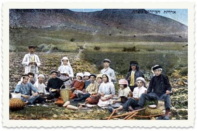 3. ארוחת צהריים בשדות החווה, 1912. צילום: בן-דב (הוספת צבע ידנית)