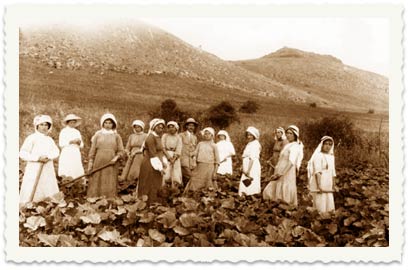 6. חוות מגדל, 1912. ה"ירקניות" פועלות בחווה עם מנהל העבודה גרשון בן צור בשדה דלועים. מימין: בת ציונה פלנדבוים-פיינשטיין, יהודית מנדלסון-אדלר, קוזלובסקי, לאה לוסבן-רוזנבליט, שרה בן צור-גרינשפן, גרשון בן-צור (מנהל העבודה), לאה כץ, תחיה ליברזון, שרה פיקסמן, דבורה מדורסקי, פיקסמן