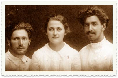 8. חוות מגדל, 1912. 1 דוד צירקין, 2 הניה, 3 צבי שץ, מחברי הקומונה של טרומפלדור. במאורעות 1921 נרצחו ביפו צבי שץ ויוסף חיים ברנר