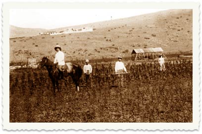 9. גידול טבק בחוות מגדל, שנות העשרה, ברקע חצר החווה