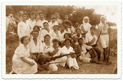 12. מגדל, 1920. חברי גדוד העבודה ואנשי קבוצת אחווה: 3 - חיה אלטשולר. דמויות נוספות בקבוצה: דולינסקי, פנינה לירמן, יוסף וזינה אטקין, חרמוני. אנשי קבוצת אחווה הקימו את קיבוץ שריד