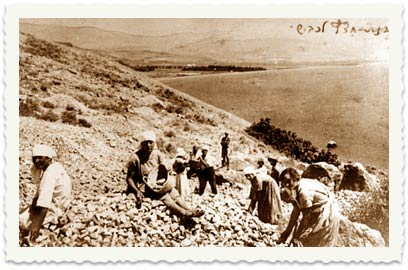 13. 1921 - חברי גדוד העבודה אשר הקימו את מחנם ליד חוות מגדל, עבדו בסלילת כביש טבריה-ט'בחה. בצילום: חציבת חצץ לכביש (מההר שמעל הגן הרוסי של היום)