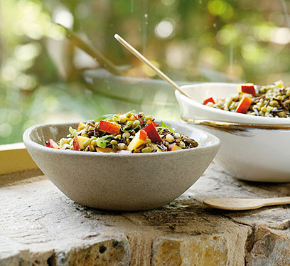 משהתחלתי לדפדף בספר לא ידעתי את נפשי מרוב תשוקה להתחיל להכין ממנו מעדנים בריאותיים, משמחי-לבב אנוש. תחילה הכנתי סלט אורז בר, שעועית מאש ומנגו (עמ' 100), שמופיע בצילום עם תפוחי עץ (כיוון שצולם בחורף, אני מניחה). המתכון לא ציין במשך כמה זמן יש לבשל את שעועית המאש עד שתהיה רכה דיה (25 דקות יספיקו); 30 הדקות שהוקצו לבישול אורז הבר לא הספיקו (40 כן); התוצאה שהתקבלה (כמות עצומה, אגב, 6-8 מנות ולא 4-6 מנות ככתוב) היתה בלתי-אסתטית ולא ממש דומה למנה שבצילום, אך זכתה לתשואות הקהל, בעיקר בגלל המנגו, שגנב את ההצגה.