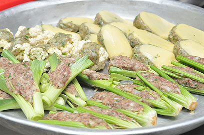 קישואים, חצילים ובצלים ממולאים באורז ובשר