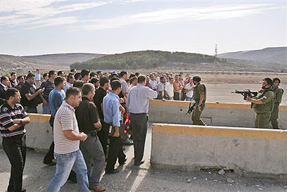 חיילים ופלסטינים במחסום חווארה, היום (צילום: AP)