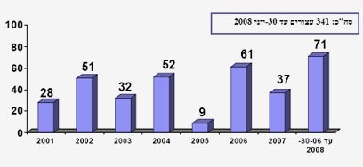 בהיקף המעורבים בטרור ממזרח ירושלים. לדבריהם, רק פעולה נחרצת באזור, בו מתגוררים כ-290 אלף פלסטינים, עשויה לסכל פיגועים. מנתוני השב"כ עולה כי משנת 2001 ועד יוני 2008 נעצרו באזור 340 פעילי טרור. הנתונים מצביעים על העלייה בעיסוק בטרור: 9 עצורים בשנת 2005, 61 ב-2006 ואילו בחציון הראשון של 2008 נעצרו 71 פלסטינים.