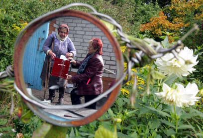 שתי נשים בקלפי בכפר קוז'ין בבלארוס (צילום: AFP)
