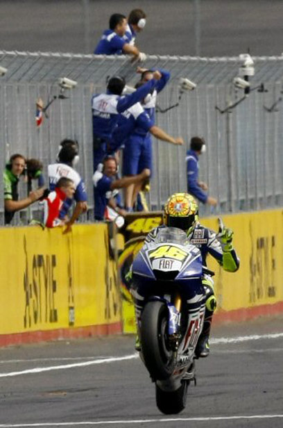 את חגיגות הניצחון החל רוסי בסגנון מוכר: האלוף האיטלקי חצה את קו הסיום עם גלגל קדמי מונף באוויר. לאחר מכן, חילק רוסי חולצות לאוהדים עליהן מודפס באיטלקית "מצטער על העיכוב". יש לציין כי רוסי יכול היה לסיים במקום השלישי במרוץ ביפן בכדי להבטיח את הזכייה באליפות - אך אף אחד לא הופתע מכך שהוא לא הסתפק בכך. אף אחד גם לא יופתע אם רוסי ינסה לנצח בכל שלושת המרוצים שנותרו עד סוף עונת 2008.
