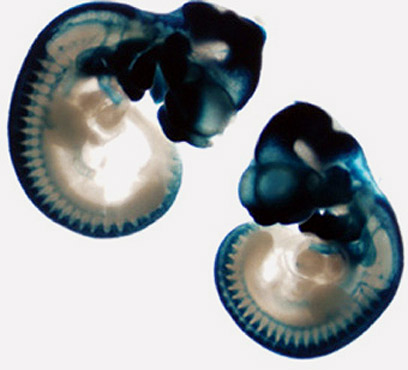 עוברי עכבר מהונדסים גנטית המבטאים גן מדווח, אשר צובע בכחול את התאים שמקורם באיזור מסוים בעובר (Neural Crest). כך ניתן לעקוב אחר התנועה וההתפתחות של תאים אלה במהלך ההתפתחות העוברית (צילום: מכון ויצמן)