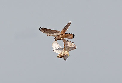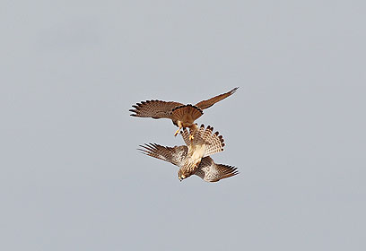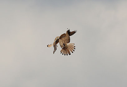 "הבז העליון בתמונה תפס את הרגל של הבז מתחתיו והתחיל לסחרר אותו כלפי מטה, בעוד שהבז התחתון פשוט השמיע צרחות אימה, מאחר שהם ירדו במהירות לעבר האדמה והבז שמעליו סירב להרפות".