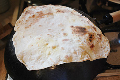 - כעבור 1-2 דקות (או כאשר הצד התחתון נראה שזוף דיו) הופכים את הפיתה בעזרת מגבת. נעזרים במגבת כדי להצמיד את הפיתה לווק, כך שתאפה בשלמותה. מסירים מן הווק, מניחים בצלחת וממשיכים עם פיסת הבצק הבאה. מגישים חם.