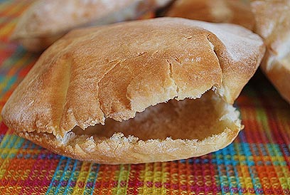 - מחממים תנור ל-220 מעלות ומכניסים את התבנית למרכז התנור או מעט נמוך ממרכז התנור. אופים כ-7-10 דקות או עד שהפיתות שזופות דיין. מוציאים ומניחים בשקית פלסטיק סגורה. כעבור 1-2 דקות מוציאים מן השקית ומגישים לשולחן. אם לא אוכלים את הפיתות מיד יש להוציאן מהשקית, כדי שלא יספגו רטיבות, בגלל האדים.
