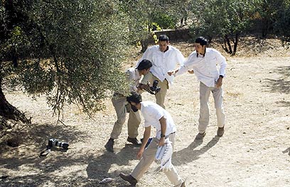 המתנחלים בועטים בצלם, שתיעד את האירוע (צילום: מגד גוזני, אקטיבסטילס)