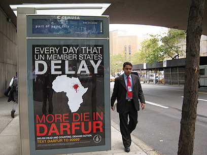 שלט סמוך למטה האו"ם המוחה על הסחבת בדרפור (צילום: דנה צימרמן)