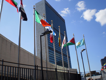 דגלי החברות באו"ם מתנופפים במטה האו"ם בניו יורק (צילום: דנה צימרמן)